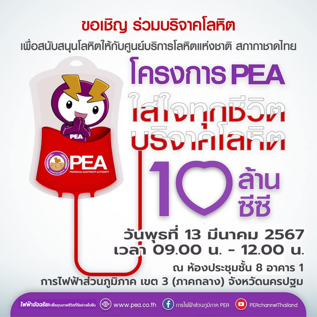 การไฟฟ้าส่วนภูมิภาค เชิญชวนร่วมบริจาคโลหิตใน “โครงการ PEA ใส่ใจทุกชีวิต บริจาคโลหิต 10 ล้านซีซี” ให้กับสภากาชาดไทย ในวันพุธที่ 13 มีนาคม 2567 เวลา 09.00 – 12.00 น. ณ ห้องประชุม ชั้น 8 อาคาร 1 การไฟฟ้าส่วนภูมิภาค เขต 3 (ภาคกลาง) จังหวัดนครปฐม