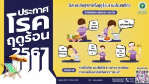 วันนี้ (8 มีนาคม 2567) แพทย์หญิงจุไร วงศ์สวัสดิ์ นายแพทย์ทรงคุณวุฒิ และโฆษกกรมควบคุมโรค กล่าวว่า ขณะนี้เข้าสู่ฤดูร้อนของประเทศไทย เริ่มตั้งแต่ปลายเดือนกุมภาพันธ์ไปจนถึงกลางเดือนพฤษภาคม อากาศที่ร้อนและแห้งแล้งเหมาะแก่การเจริญเติบโตของเชื้อโรคหลายชนิด โดยเฉพาะเชื้อโรคที่ปนเปื้อนในน้ำ และอาหาร ส่งผลให้อาหารบูดเสียได้ง่าย รวมถึงความร้อนอาจทำให้เกิดการภัยสุขภาพที่ส่งผลกระทบโดยตรงต่อประชาชนได้ กรมควบคุมโรค จึงขอออกประกาศเตือน เรื่อง การป้องกันโรคและภัยสุขภาพ ที่อาจเกิดในช่วงฤดูร้อนของประเทศไทย พ.ศ. 2567 เพื่อให้ประชาชนสามารถ ลดความเสี่ยงและดูแลสุขภาพอนามัยของตนเองได้อย่างถูกต้อง