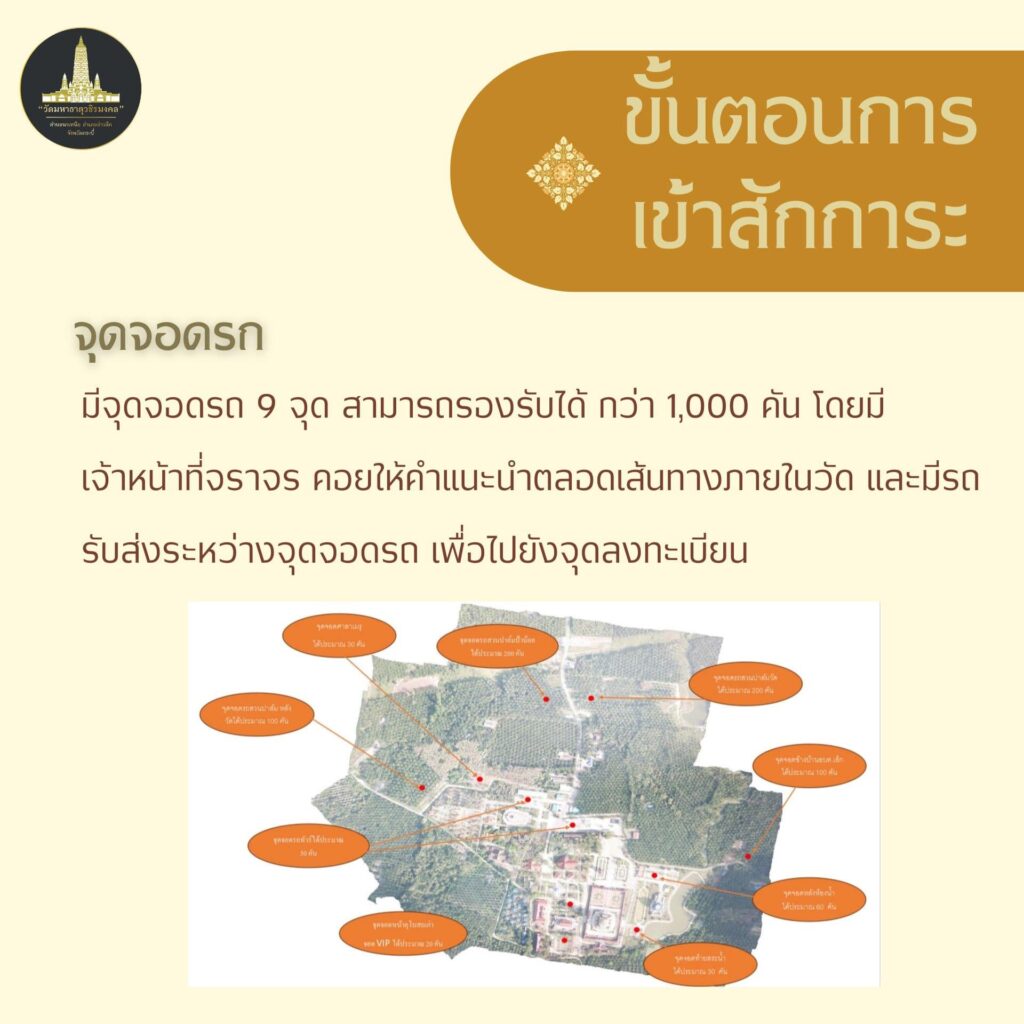 - ในการจอดรถโปรดปฏิบัติตามคำแนะนำของเจ้าหน้าที่จราจร ซึ่งเตรียมไว้ 9 จุดจอด รองรับได้ 1,000 คัน