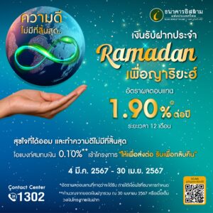 ธนาคารอิสลามแห่งประเทศไทย ออกโครงการเงินรับฝากประจำรอมฎอนเพื่อญาริยะฮ์ ระยะเวลาฝาก 12 เดือน