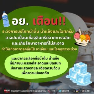 สำนักงานคณะกรรมการอาหารและยา เตือนประชาชน ระวังการบริโภคน้ำดื่ม น้ำแข็ง และไอศกรีม อาจปนเปื้อนเชื้อจุลินทรีย์ จากการผลิตและเก็บรักษาอาหารที่ไม่สะอาด ทำให้เกิดอาการคลื่นไส้ อาเจียน และโรคอุจจาระร่วง แนะนำควรเลือกซื้อน้ำดื่ม น้ำแข็ง ที่มีภาชนะบรรจุที่สะอาดและปิดสนิท มีฉลากแสดงรายละเอียดครบถ้วน เพื่อความปลอดภัย