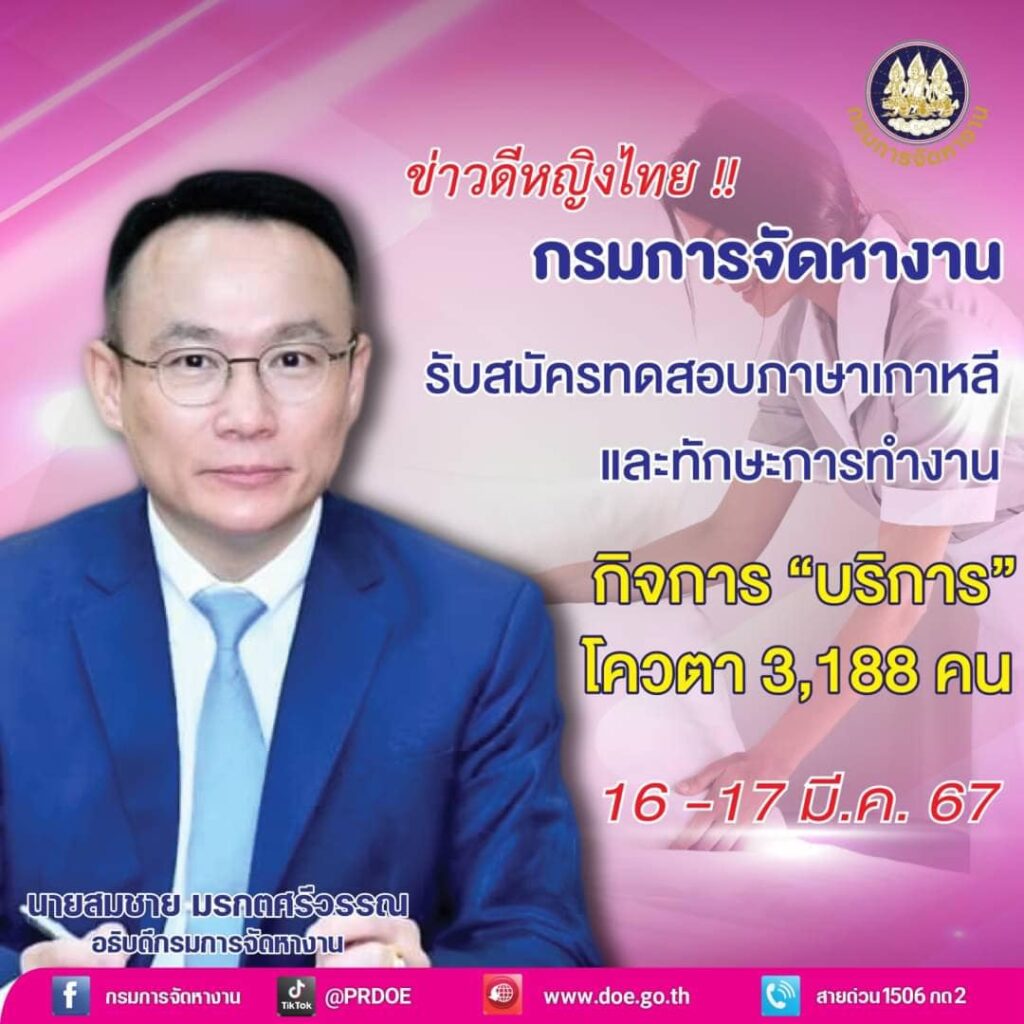 กรมการจัดหางาน เปิดรับหญิงไทยทำงานเกาหลี โควตา 3,188 คน ระหว่าง 16 – 17 มี.ค. 67