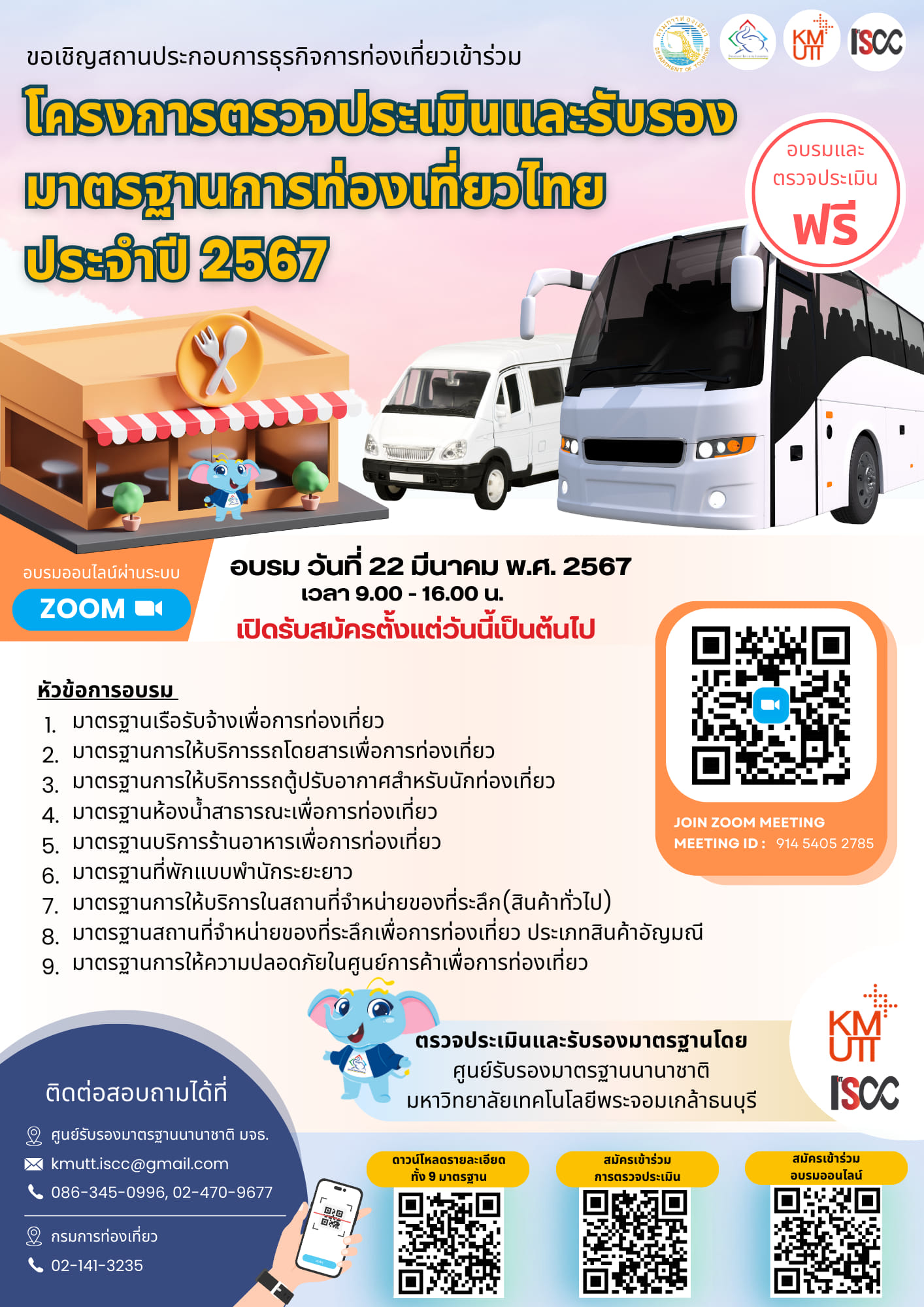 กรมการท่องเที่ยว จัดการอบรมเพื่อเตรียมความพร้อมเข้าสู่มาตรฐานบริการท่องเที่ยว ประจำปี 2567 วันที่ 22 มีนาคม 2567 เวลา 09.00 – 16.00 น. ทางออนไลน์ ZOOM MEETING ผู้ที่สนใจสามารถลงทะเบียนได้โดยไม่มีค่าใช้จ่าย สอบถามรายละเอียดเพิ่มเติมได้ที่ ศูนย์รับรองระบบมาตรฐานนานาชาติ มหาวิทยาลัยเทคโนโลยี พระจอมเกล้าธนบุรี โทร. 02 470 9677, 086 345 0996
