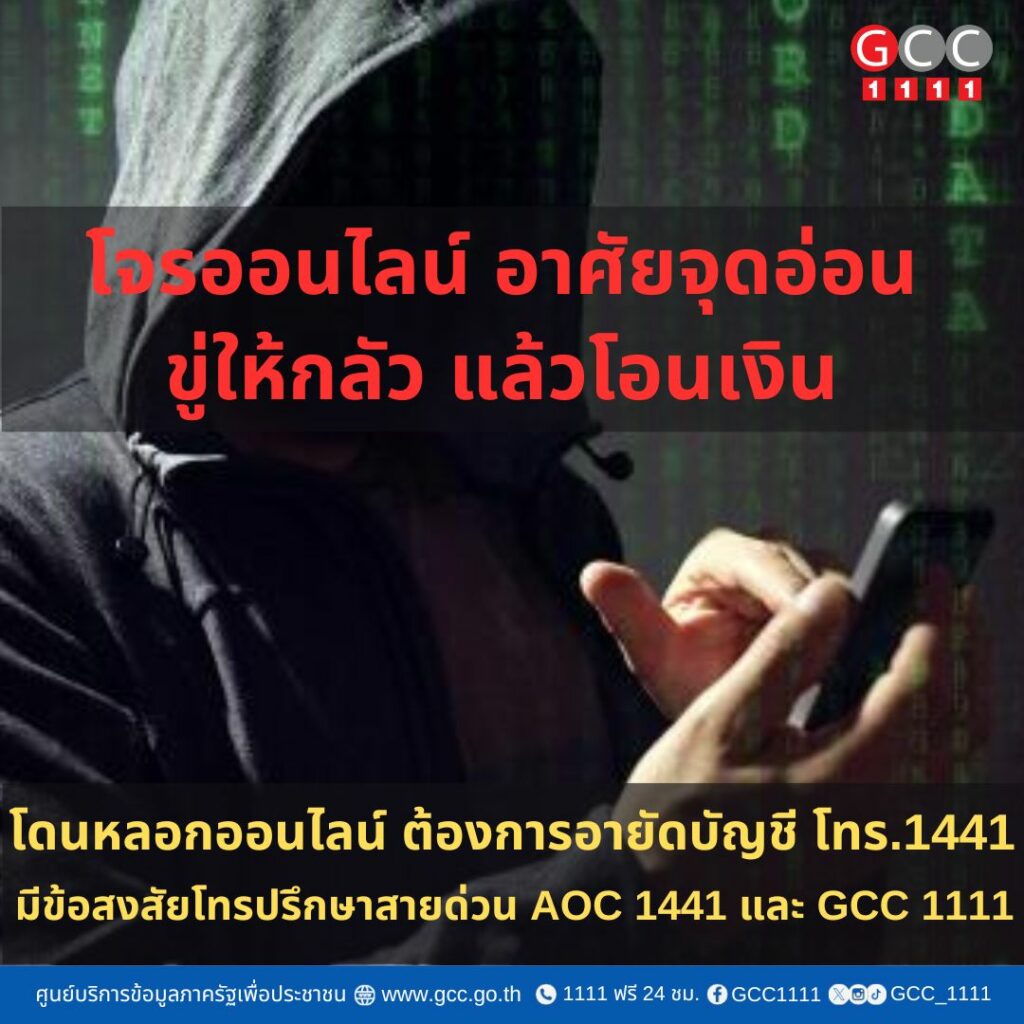 ทั้งนี้ หากประชาชนโดนหลอกออนไลน์ โทรแจ้งดำเนินการ ระงับ อายัดบัญชี AOC 1441 หรือมีข้อสงสัยโทรปรึกษาสายด่วน AOC 1441 และ GCC 1111 โทรฟรีตลอด 24 ชม.