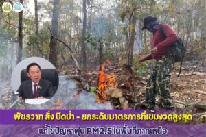“ภาพรวมสถานการณ์ฝุ่นละออง PM2.5 ในขณะนี้ พื้นที่กรุงเทพมหานครและปริมณฑล อยู่ในเกณฑ์มาตรฐานทุกพื้นที่ ส่วนใหญ่อยู่ในระดับดีถึงปานกลาง (สีเขียว/สีเหลือง) เริ่มมาตั้งแต่ 19 กุมภาพันธ์ จากมาตรการยกระดับน้ำมันยูโร 5 (EURO 5) การควบคุมการเผาในที่โล่งของพื้นที่ภาคกลางและกรุงเทพฯ และการควบคุมแหล่งต้นตอฝุ่น สำหรับสถานการณ์ฝุ่นละออง PM2.5 ในพื้นที่ 17 จังหวัดภาคเหนือ มีค่าเกินมาตรฐาน ส่วนใหญ่อยู่ในระดับเริ่มมีผลกระทบต่อสุขภาพ (สีส้ม) แต่แนวโน้มค่ารายชั่วโมงเริ่มลดลงในหลายจังหวัด จังหวัดที่ยังคงต้องเฝ้าระวังคือ น่าน แม่ฮ่องสอน และเชียงราย ซึ่งอยู่ในระดับมีผลกระทบต่อสุขภาพ (สีแดง) สถานการณ์มีแนวโน้มที่จะบรรเทาลงช่วงวันที่ 10-13 มีนาคม 2567 แต่จะต้องเฝ้าระวังอีกครั้งระหว่างวันที่ 14-17 มีนาคม 2567 เนื่องจากลมเปลี่ยนทิศ ลมที่ปกคลุมบริเวณภาคเหนือตอนบนจะเปลี่ยนเป็นลมที่พัดจากทิศตะวันตกเข้าสู่ประเทศอีกครั้ง ดังนั้น หากสถานการณ์จุดความร้อนในประเทศและนอกประเทศยังคงมีจำนวนที่มากในช่วงเวลาดังกล่าว สถานการณ์อาจทวีความรุนแรงขึ้นได้อีก ในด้านการจัดการไฟในพื้นที่ป่า กรมอุทยานแห่งชาติ สัตว์ป่า และพันธ์ุพืช และกรมป่าไม้ ภายใต้การสนธิกำลังกับจังหวัด ฝ่ายปกครอง มีการยกระดับการแก้ไขปัญหา ภาพรวมจุดความร้อนลดลงกว่า 40% มีการปรับกำลังของกระทรวงทรัพย์ฯ จากภูมิภาคอื่นมาอยู่ภาคเหนือหมดแล้ว และหลังจากได้รับการจัดสรรงบกลางจะมีการวางกำลังตามจุดสกัดในพื้นที่เป้าหมายมุ่งเป้าได้เพิ่มขึ้น เน้นการสร้างความเข้าใจให้กับเครือข่ายและให้เจ้าหน้าที่ปฏิบัติงานตลอด 24 ชั่วโมง และสื่อสารกับประชาชนขอความร่วมมือไม่เผาป่า” นายจตุพร กล่าว