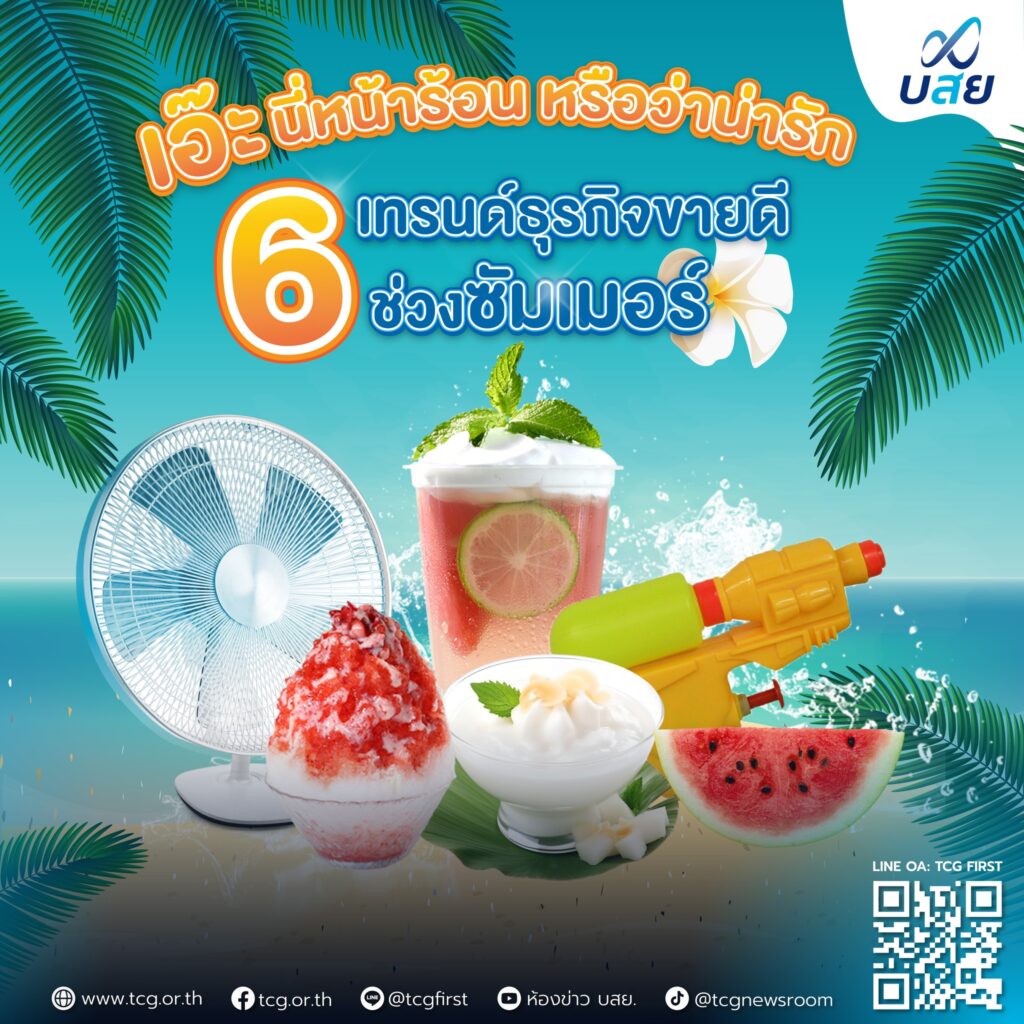 บรรษัทประกันสินเชื่ออุตสาหกรรมขนาดย่อม แนะนำ 6 เทรนด์ธุรกิจขายดีช่วงซัมเมอร์ ได้แก่ เครื่องดื่มสมุนไพร น้ำเเข็งใส ขนมหวานไทย ผลไม้คลายร้อน สินค้าออนไลน์รับลมร้อน ปืนฉีดน้ำ