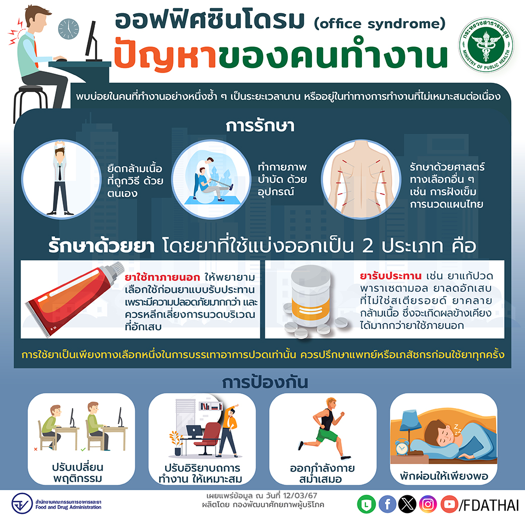 สำนักงานคณะกรรมการอาหารและยา แนะนำอาการออฟฟิศซินโดรม ปัญหาของคนทำงาน โดยมักพบได้บ่อยในคนที่ทำงานอย่างหนึ่งซ้ำ ๆ เป็นระยะเวลานาน หรืออยู่ในท่าทางการทำงานที่ไม่เหมาะสมต่อเนื่อง เช่น นั่งทำงานนาน ๆ ในท่าเดิมหน้าจอคอมพิวเตอร์ และอาจเกิดจากปัจจัยอื่น ๆ เช่น สภาพแวดล้อมหรืออุปกรณ์ในการทำงานที่ไม่เหมาะสม ความเครียดจากการทำงาน หรือการพักผ่อนที่ไม่เพียงพอ