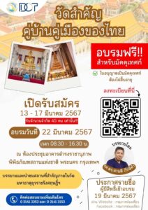 กรมการท่องเที่ยว เปิดรับสมัคร การฝึกอบรมวัดสำคัญคู่บ้านคู่เมืองของไทย อบรมฟรี ไม่มีค่าใช้จ่าย ตั้งแต่บัดนี้ – 17 มีนาคม 2567 โดยแสกน QR Code ในภาพ (รับเพียง 45 คนเท่านั้น)