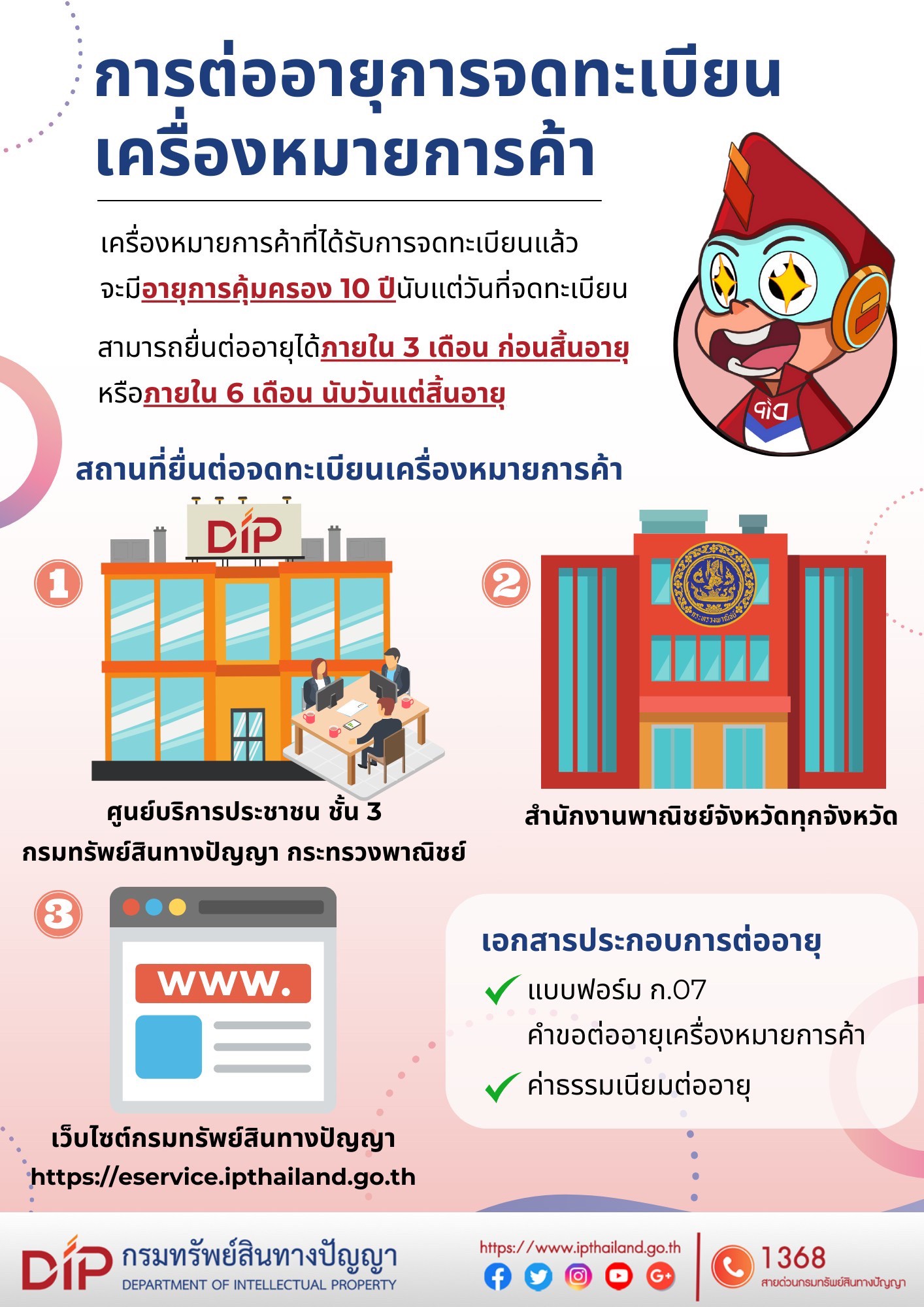 กรมทรัพย์สินทางปัญญา แจ้งการต่ออายุการจดทะเบียนเครื่องหมายการค้า โดยเครื่องหมายการค้าที่ได้รับการจดทะเบียนแล้วจะมีอายุการคุ้มครอง 10 ปี นับแต่วันที่จดทะเบียน สามารถยื่นต่ออายุได้ภายใน 3 เดือน ก่อนสิ้นอายุ หรือภายใน 6 เดือน นับวันแต่สิ้นอายุ