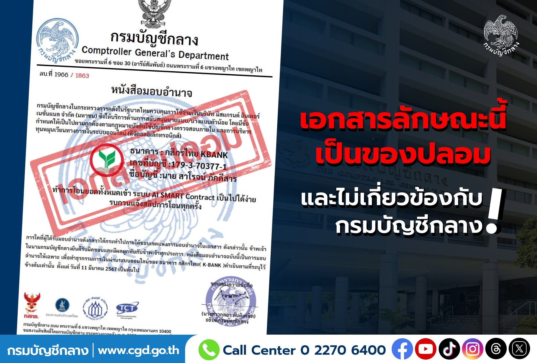 กรมบัญชีกลาง เตือนอย่าหลงเชื่อเอกสารปลอม พร้อมยืนยันไม่เกี่ยวข้องกับกรมบัญชีกลางแต่อย่างใด