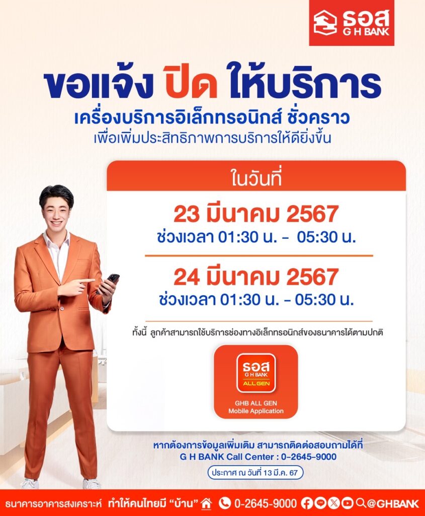 ธนาคารอาคารสงเคราะห์ แจ้งปิดให้บริการเครื่องบริการอิเล็กทรอนิกส์ชั่วคราว วันที่ 23 – 24 มีนาคม 2567