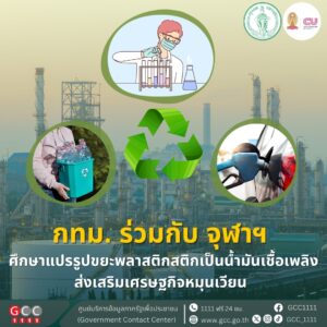 กรุงเทพมหานคร จับมือ จุฬาฯ ศึกษาแปรรูปขยะพลาสติกสติกเป็นน้ำมันเชื้อเพลิง ส่งเสริมเศรษฐกิจหมุนเวียน สำหรับโครงการศึกษาวิจัยการแปรรูปขยะพลาสติกของกรุงเทพมหานครเป็นน้ำมันเชื้อเพลิงโดยวิธีไพโรไลซิส จุดประสงค์เพื่อร่วมมือทางวิชาการในการพัฒนาแนวทางแก้ไขปัญหาขยะมูลฝอยชุมชนที่เกิดขึ้นในปัจจุบันของกรุงเทพมหานคร และร่วมกันส่งเสริมเศรษฐกิจหมุนเวียนตามวาระแห่งชาติการขับเคลื่อนเศรษฐกิจ BCG Model (Bio-Circular-Green Economy) ในส่วนของเศรษฐกิจหมุนเวียน (Circular Economy) เพื่อนำขยะพลาสติกมาใช้ให้เกิดประโยชน์สูงสุดในด้านพลังงานโดยการผลิตเป็นน้ำมันเชื้อเพลิง
