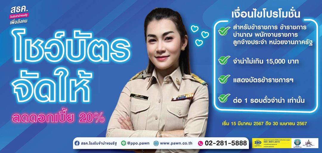 สถานธนานุเคราะห์ โรงรับจำนำของรัฐ ประกาศ Promotion “โชว์บัตร จัดให้” สำนักงานธนานุเคราะห์ เพียงแค่ “โชว์บัตร ข้าราชการ ข้าราชการบำนาญ พนักงานราชการ หรือลูกจ้างประจำหน่วยงานราชการ สธค. ก็จัดให้” เมื่อมาจำนำเงินต้นไม่เกิน 15,000 บาท ลดดอกเบี้ย 20% ของดอกเบี้ยที่ต้องชำระเมื่อมาทำธุรกรรมครั้งต่อไป (ต่อ 1 รอบตั๋วจำนำ) เริ่มวันที่ 15 มีนาคม – 30 เมษายน 2567 ต้องการจำนำทรัพย์ แต่อยากเชควงเงินก่อนสามารถประเมินทรัพย์ออนไลน์ เพียงคลิกลิงก์นี้ https://bit.ly/3qT14ci