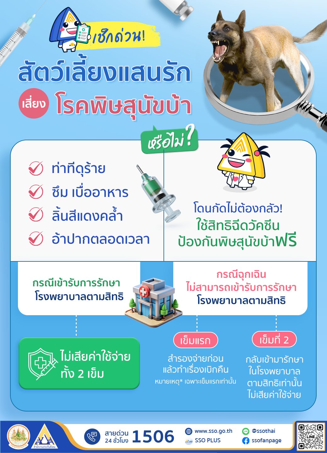 - ผู้ประกันตนสามารถใช้สิทธิประกันสังคมเข้ารับการรักษาด้วยการฉีดวัคซีนป้องกันโรคพิษสุนัขบ้าโดยไม่ต้องเสียค่าใช้จ่าย