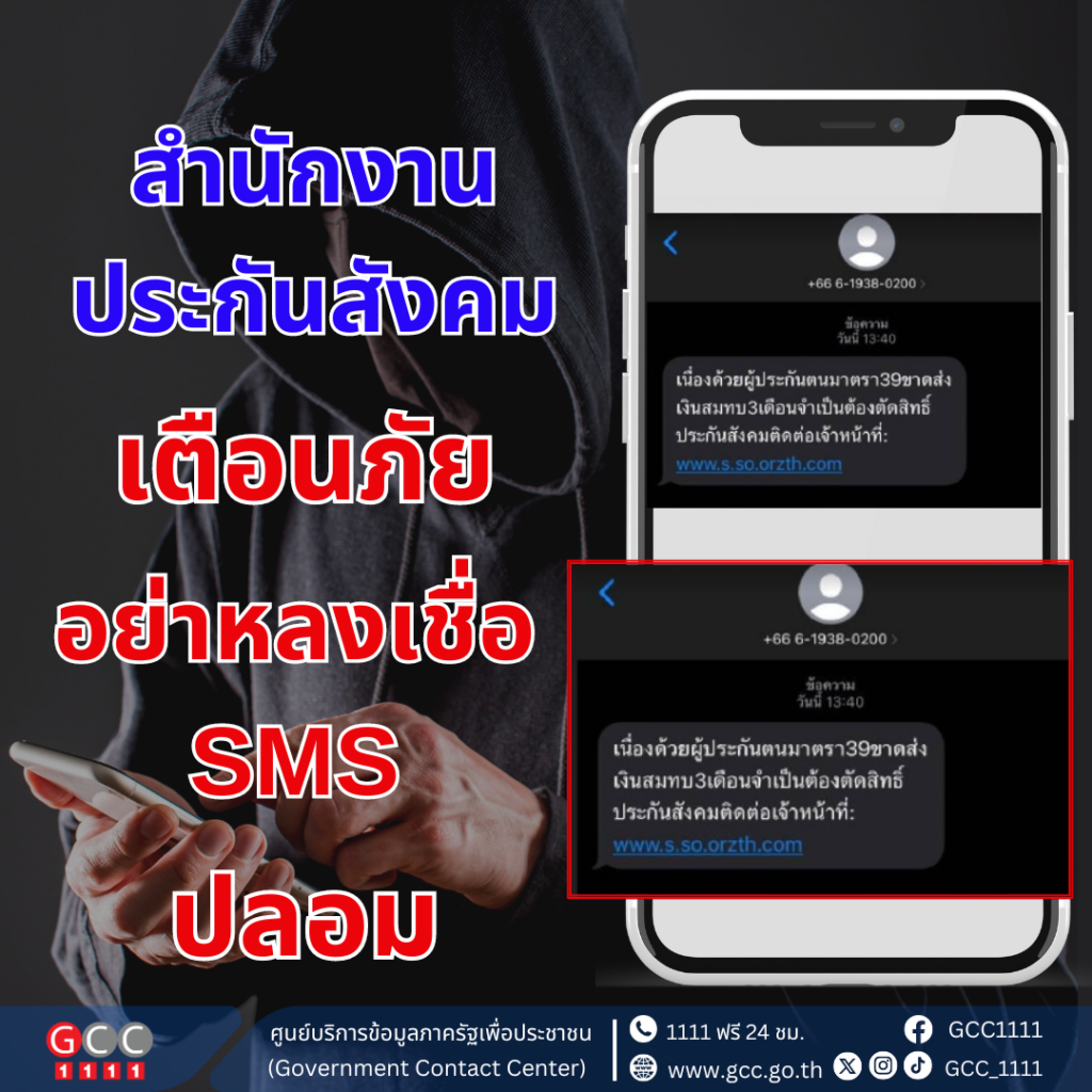 สำนักงานประกันสังคม เตือนภัยอย่าหลงเชื่อ SMS ปลอม สำนักงานประกันสังคมไม่มีนโยบาย ส่ง SMS แบบแนบลิงก์ ให้ผู้ประกันตนทุกกรณี