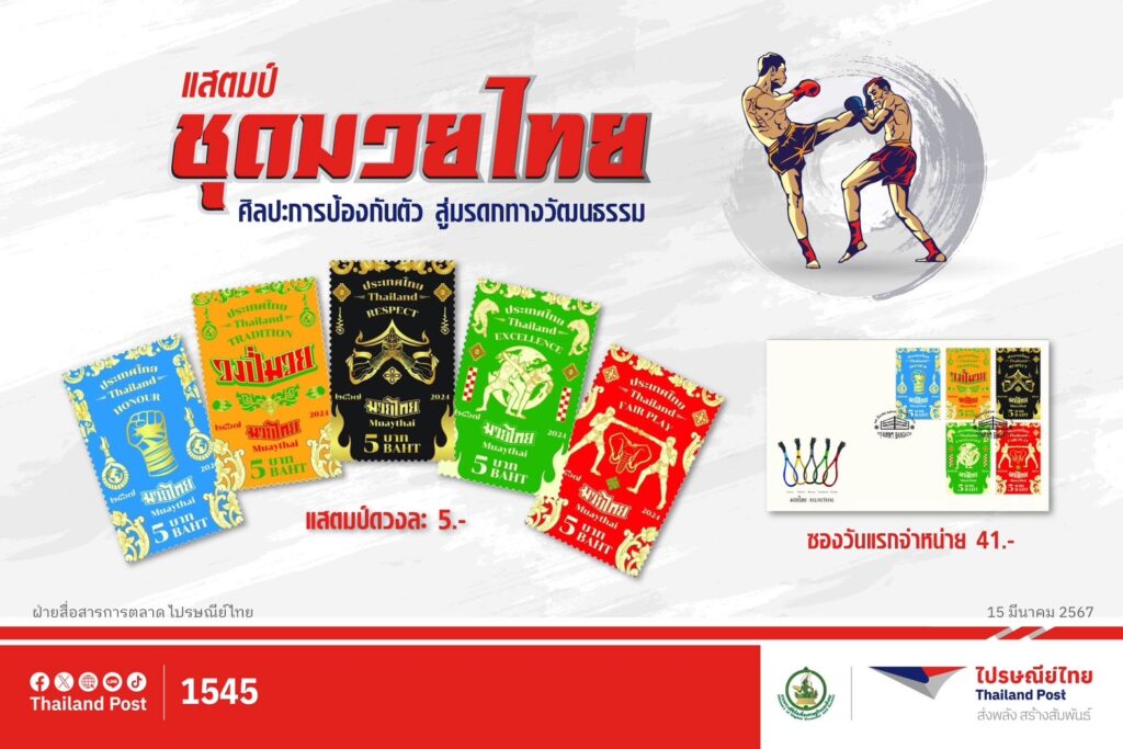 บริษัท ไปรษณีย์ไทย จำกัด เปิดจำหน่ายแสตมป์ “มวยไทย” ศิลปะการป้องกันตัว สู่มรดกทางวัฒนธรรม โดยใช้ดีไซน์ที่สะท้อนถึง 5 แนวคิดหลักพื้นฐานของกีฬามวยไทย ผ่าน 5 โทนสีร้อนแรง พร้อมลวดลายกราฟิกที่มีความหมาย เริ่มจำหน่ายวันที่ 15 มีนาคม 2567 ราคาชุดละ 25 บาท (1 ชุดมี 5 ดวง) ซองวันแรกจำหน่าย 41 บาท