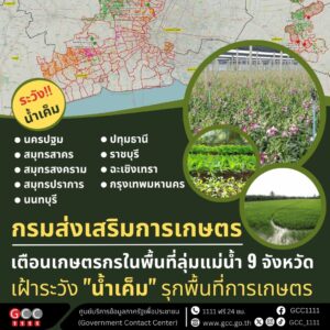 กรมส่งเสริมการเกษตร ขอให้เกษตรกรในพื้นที่ลุ่มแม่น้ำ 9 จังหวัด เฝ้าระวังน้ำเค็มรุกพื้นที่การเกษตร ได้แก่ จังหวัดนครปฐม สมุทรสาคร สมุทรสงคราม สมุทรปราการ นนทบุรี ปทุมธานี ราชบุรี ฉะเชิงเทรา และกรุงเทพมหานคร