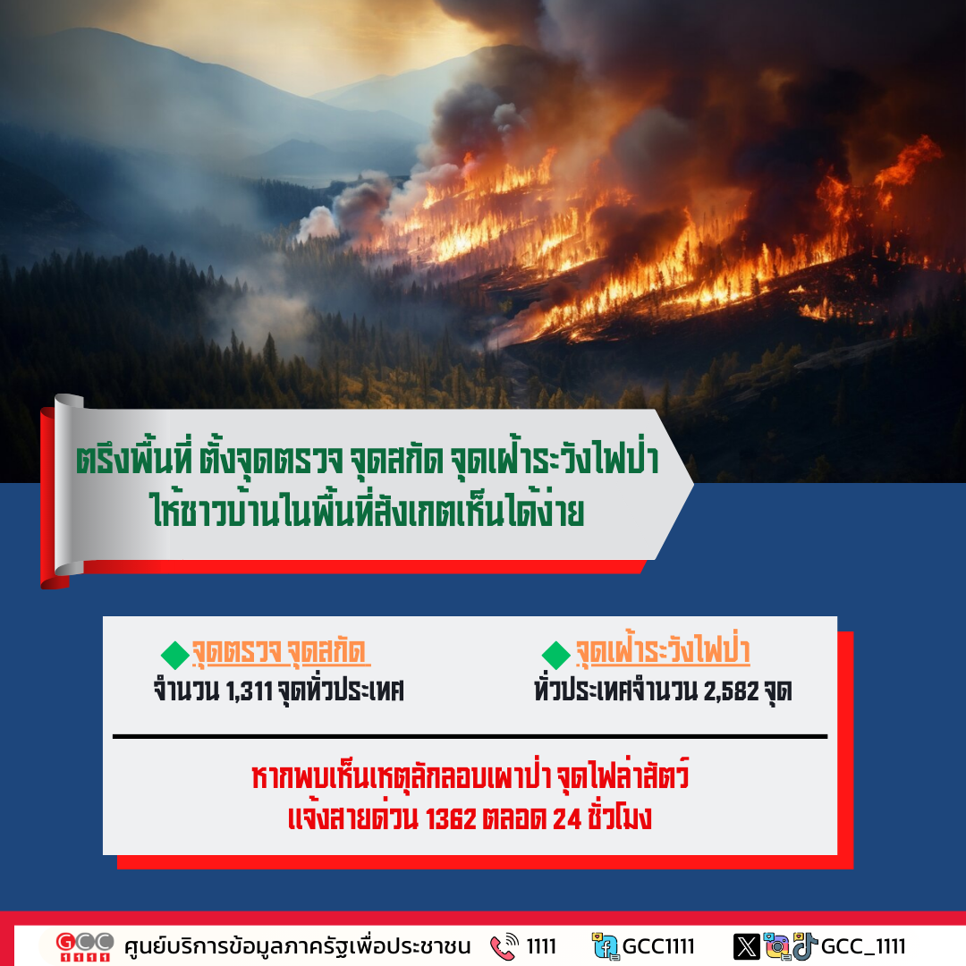 กรมอุทยานแห่งชาติ สัตว์ป่า และพันธุ์พืช ดำเนินการตั้งจุดตรวจ จุดสกัด จุดเฝ้าระวังไฟป่า ให้ชาวบ้านในพื้นที่สังเกตเห็นได้ง่าย และสามารถแจ้งเมื่อมีเบาะแส หรือเมื่อเกิดเหตุไฟป่าได้อย่างรวดเร็ว ทันต่อเหตุการณ์ หากพบเห็นเหตุลักลอบเผาป่า จุดไฟล่าสัตว์ แจ้งสายด่วน 1362 ตลอด 24 ชั่วโมง