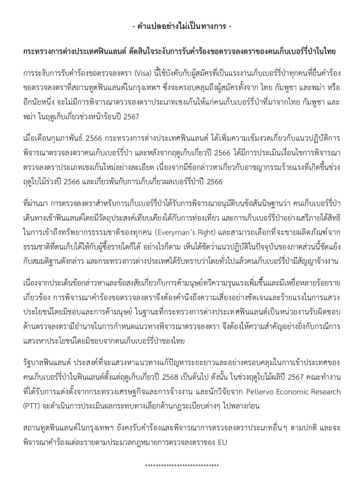 กระทรวงการต่างประเทศฟินแลนด์ ตัดสินใจระงับการรับคําร้องขอตรวจลงตราของคนเก็บเบอร์รี่ป่าในไทย การระงับการรับคําร้องขอตรวจลงตรา (Visa) นี้ใช้บังคับกับผู้สมัครที่เป็นแรงงานเก็บเบอร์รี่ป่าทุกคนที่ยื่นคําร้อง ขอตรวจลงตราที่สถานทูตฟินแลนด์ในกรุงเทพฯ ซึ่งจะครอบคลุมถึงผู้สมัครทั้งจาก ไทย กัมพูชา และพม่า หรือ อีกนัยหนึ่ง จะไม่มีการพิจารณาตรวจลงตราประเภทเชงเก้นให้แก่คนเก็บเบอร์รี่ป่าที่มาจากไทย กัมพูชา และ พม่า ในฤดูเก็บเกี่ยวช่วงหน้าร้อนปี 2567