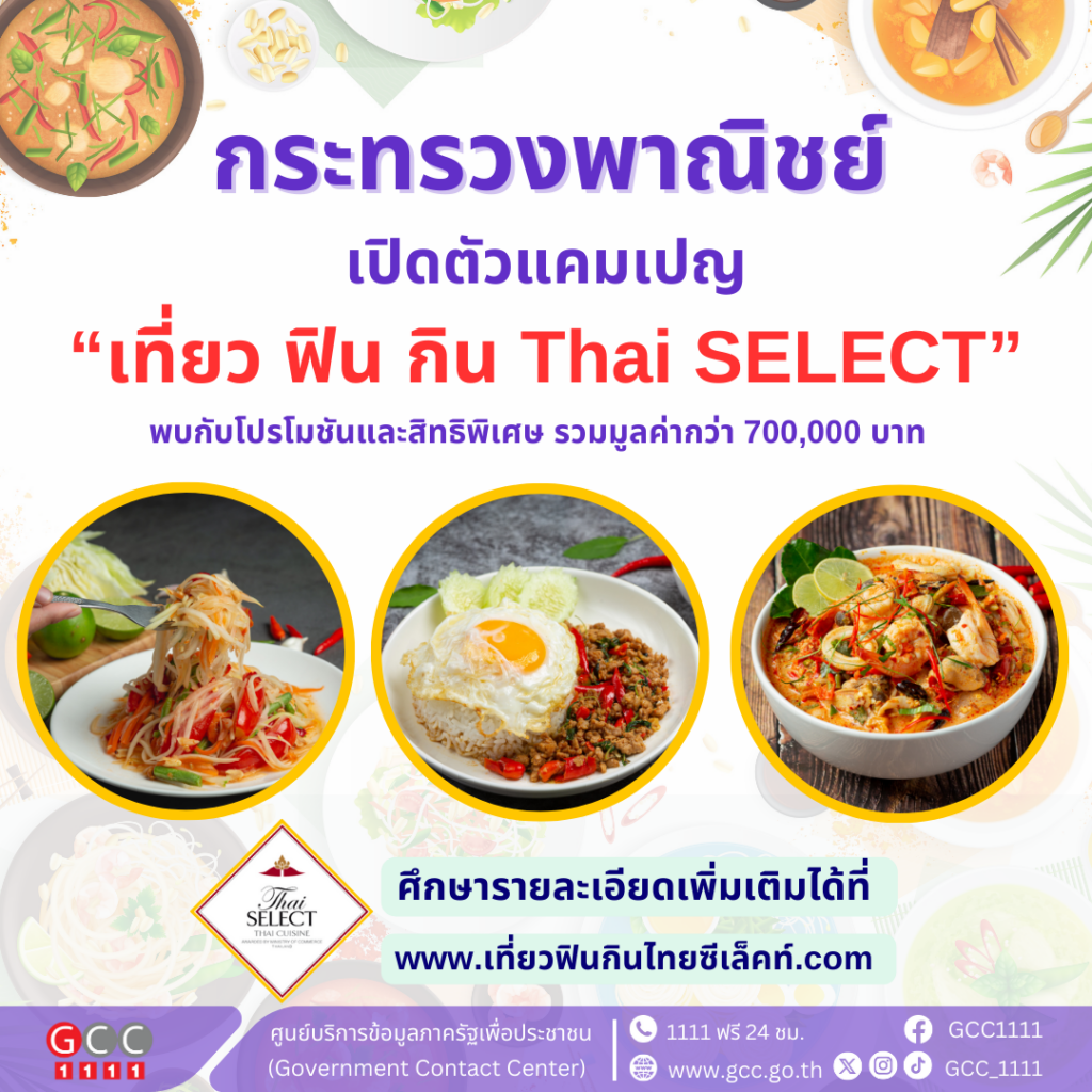 กระทรวงพาณิชย์ ได้เปิดตัวแคมเปญ “เที่ยว ฟิน กิน Thai SELECT” เพื่อขับเคลื่อนเศรษฐกิจด้วยพลังของอาหารไทย โดยเฉพาะร้านอาหาร Thai SELECT ที่อยู่ในการส่งเสริมของกรมพัฒนาธุรกิจการค้าให้เป็นที่รู้จักแก่นักท่องเที่ยว การันตีมาตรฐานอาหารไทย การใช้วัตถุดิบในท้องถิ่นที่ดี สะอาด ถูกสุขอนามัย สะท้อนวัฒนธรรมความเป็นไทย บริการแบบมืออาชีพ ได้จับมือกับการท่องเที่ยวแห่งประเทศไทย และ 3 พันธมิตร ได้แก่ บัตรกรุงไทย ไลน์แมน และแม็คโคร