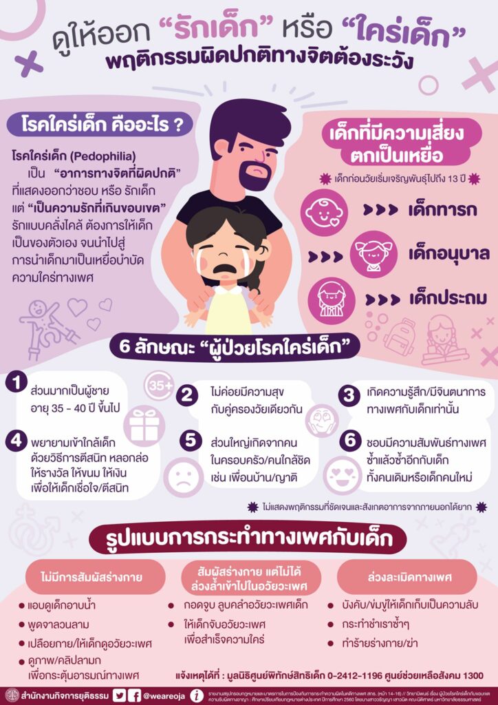 • กระทรวงยุติธรรม เปิดเผยโรคใคร่เด็ก ดูให้ออก “รักเด็ก” หรือ “ใคร่เด็ก” พฤติกรรมผิดปกติทางจิตต้องระวัง