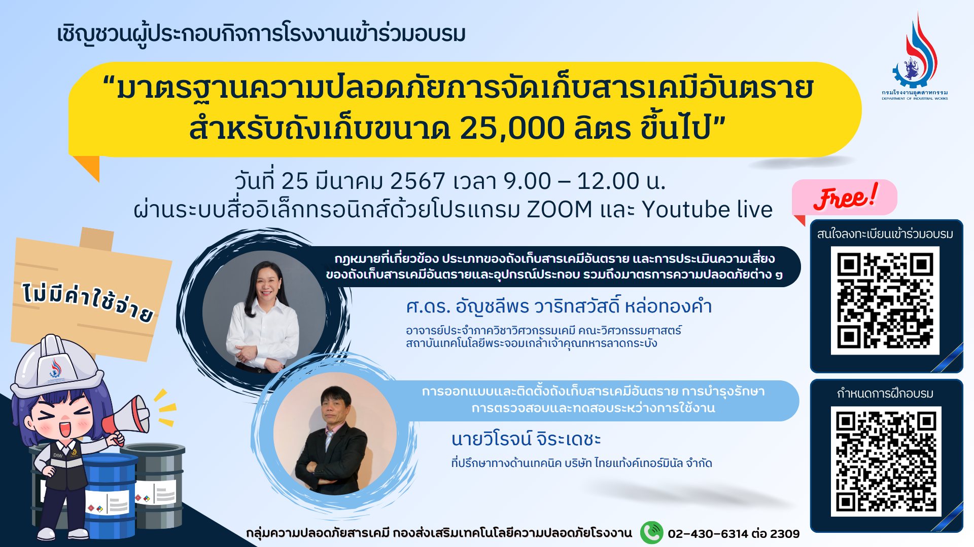 กรมโรงงานอุตสาหกรรม จัดการอบรม มาตราฐานความปลอดภัยการจัดเก็บสารอันตราย สำหรับถังเก็บขนาด 25,000 ลิตร ขึ้นไป วันที่ 25 มีนาคม 2567 เวลา 9.00 – 12.00 น. ผ่านระบบสื่ออิเล็กทรอนิกส์ด้วยโปรแกรม ZOOM และ YouTube live โดยไม่มีค่าใช้จ่าย