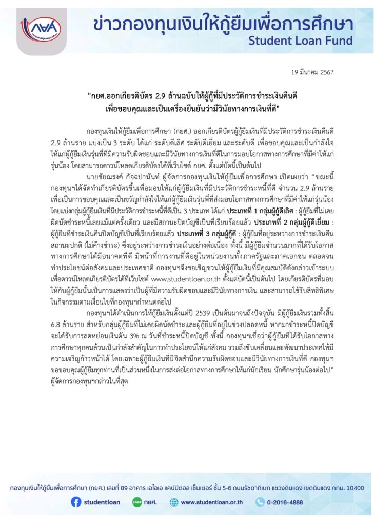 กองทุนเงินให้กู้ยืมเพื่อการศึกษา ออกเกียรติบัตรผู้กู้ยืมเงินที่มีประวัติการชำระเงินคืนดี จำนวน 2.9 ล้านราย เพื่อขอบคุณและเป็นกำลังใจให้แก่ผู้กู้ยืมเงินรุ่นพี่ที่มีความรับผิดชอบและมีวินัยทางการเงินที่ดีในการมอบโอกาสทางการศึกษาที่มีค่าให้แก่รุ่นน้อง โดยแบ่งกลุ่มผู้กู้ยืมเงินที่มีประวัติการชำระหนี้ที่ดีเป็น 3 ประเภท ได้แก่