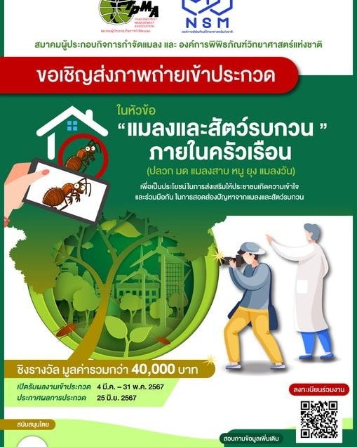 องค์การพิพิธภัณฑ์วิทยาศาสตร์แห่งชาติ (อพวช.) หรือ NSM ร่วมกับ สมาคมผู้ประกอบกิจการกำจัดแมลง (TPMA) จัดโครงการประกวดภาพถ่ายแมลงและสัตว์รบกวนภายในครัวเรือน เพื่อนำภาพถ่ายที่ผ่านเข้าประกวดไปเผยแพร่สู่สาธารณะต่อไป นำไปสู่การส่งเสริมให้ประชาชนเกิดความเข้าใจ และร่วมมือกันสอดส่องปัญหาจากแมลงและสัตว์รบกวน เชิญชวนส่งภาพถ่ายเข้าประกวด หัวข้อ “แมลงและสัตว์รบกวนภายในครัวเรือน” เปิดรับผลงานตั้งแต่บัดนี้ – 31 พฤษภาคม 2567 และประกาศผล วันที่ 25 มิถุนายน 2567 ชิงเงินรางวัลกว่า 40,000 บาท พร้อมใบประกาศนียบัตร รายละเอียดโครงการ และการส่งผลงานเข้าประกวด คลิก https://www.nsm.or.th/nsm/th/node/54787 สอบถามเพิ่มเติมที่ โทร. 0 2722 1172-3 Facebook : สมาคมผู้ประกอบกิจการการกำจัดแมลง TPMA