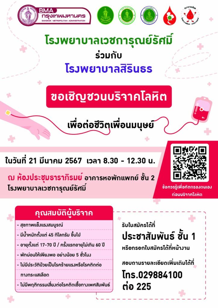 โรงพยาบาลเวชการุณย์รัศมิ์ ร่วมกับ โรงพยาบาลสิรินธร จัดกิจกรรมรับบริจาคโลหิตเพื่อต่อชีวิตเพื่อนมนุษย์ วันที่ 21 มีนาคม 2567 เวลา 08.30 – 12.30 น. ณ ห้องประชุมธาราภิรมย์ อาคารหอพักแพทย์ ชั้น 2