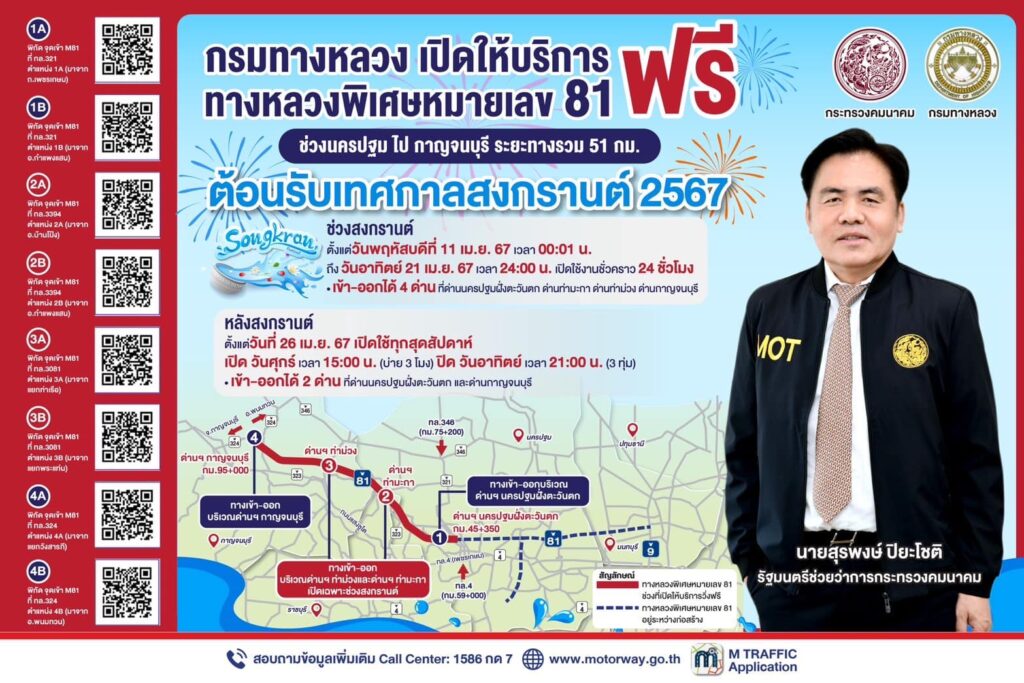 - กระทรวงคมนาคม เปิดวิ่งฟรี มอเตอร์เวย์บางใหญ่ – กาญจนบุรี ช่วงเทศกาลสงกรานต์ 2567