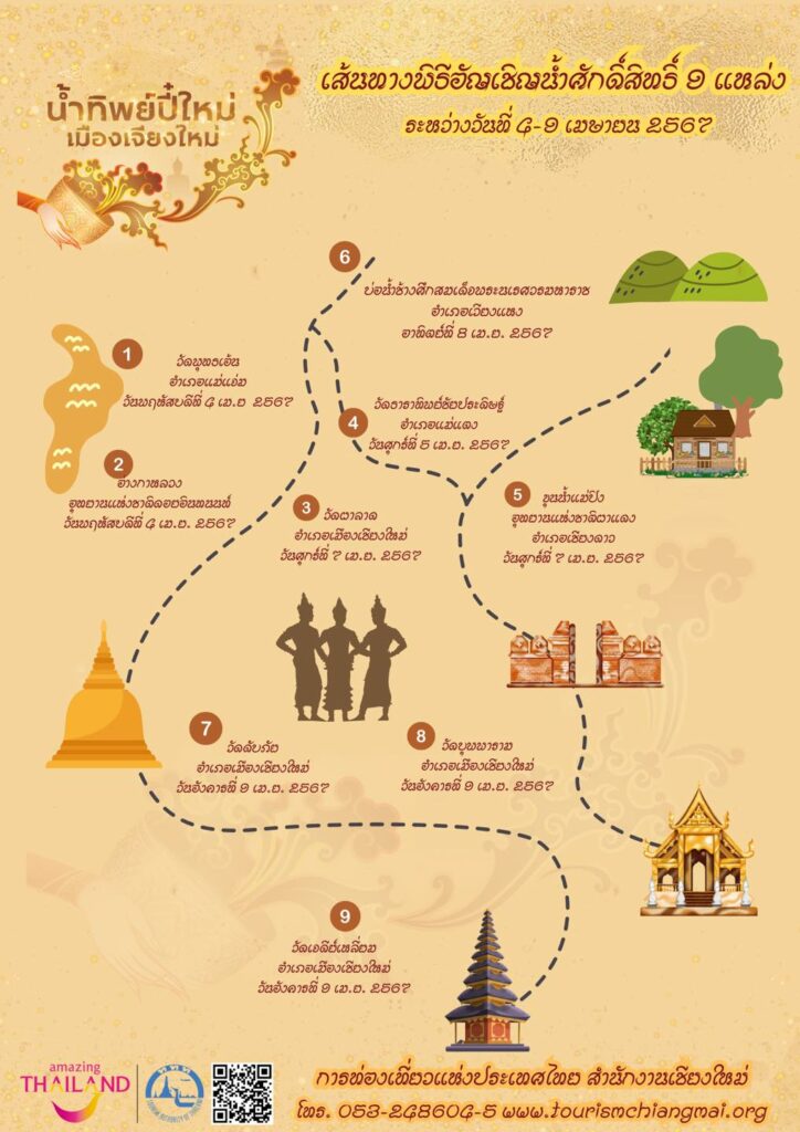 ร่วมสืบสานพิธีโบราณล้านนา พิธีกรรมศักดิ์สิทธิ์จาก 9 แหล่งน้ำทั่วเมืองเชียงใหม่ สู่”น้ำทิพย์ปีใหม่เมืองเชียงใหม่” ระหว่างวันที่ 4 – 9 เมษายน 2567  พิธีการหุงน้ำศักดิ์สิทธิ์ และเจริญพุทธมนต์ ในวันที่ 10 เมษายน 2567 ณ วัดพระธาตุดอยสุเทพราชวรวิหาร