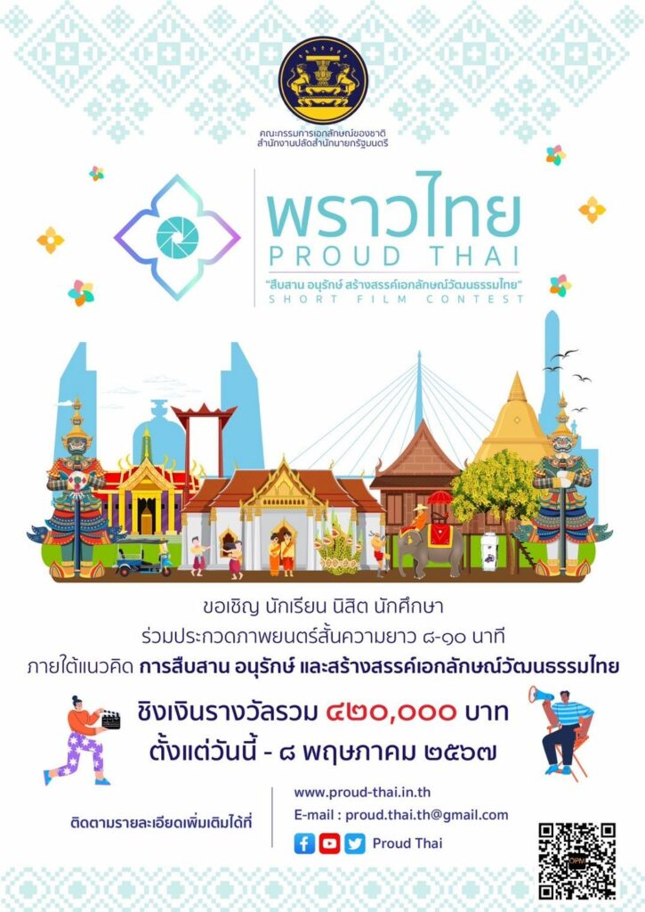 สำนักงานปลัดสำนักนายกรัฐมนตรี เชิญชวนนักเรียน นิสิต นักศึกษาร่วมการประกวดภาพยนตร์สั้น Short Film Contest “พราวไทย : ProudThai สืบสานอนุรักษ์สร้างสรรค์เอกลักษณ์ วัฒนธรรมไทย” ภายใต้แนวคิดการสืบสาน อนุรักษ์ และสร้างสรรค์เอกลักษณ์วัฒนธรรมไทย ความยาว 8 – 10 นาที ชิงเงินรางวัลรวม 420,000 บาท ตั้งแต่บัดนี้ – 8 พฤษภาคม 2567