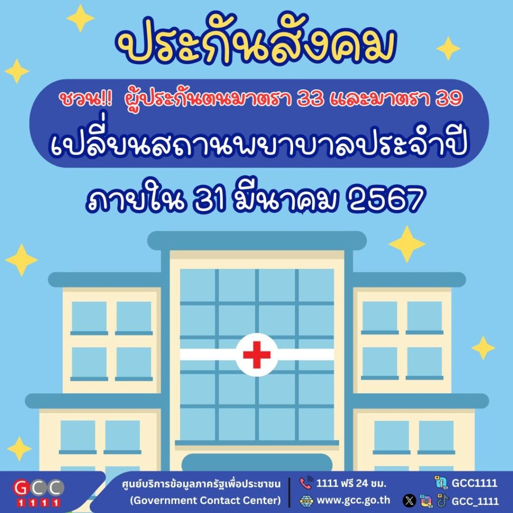 สำนักงานประกันสังคม เปิดโอกาสให้ผู้ประกันตนสามารถขอเปลี่ยนสถานพยาบาลใหม่ได้ปีละ 1 ครั้ง ซึ่งในปี 2567 ผู้ประกันตนมาตรา 33 และมาตรา 39 สามารถเปลี่ยนสถานพยาบาลได้ภายในวันที่ 31 มีนาคม 2567
