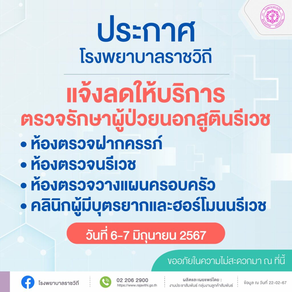 โรงพยาบาลราชวิถี ประกาศแจ้งลดให้บริการตรวจรักษาผู้ป่วยนอกสูตินรีเวช วันที่ 6 – 7 มิถุนายน 2567