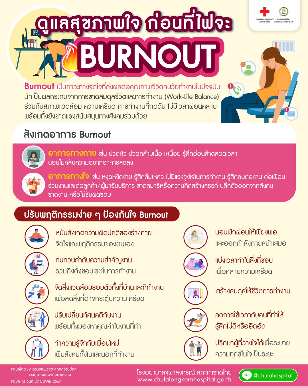 โรงพยาบาลจุฬาลงกรณ์ สภากาชาดไทย แนะนำดูแลสุขภาพใจ ก่อนที่ไฟจะ Burnout โดย Burnout เป็นภาวะทางจิตใจที่ส่งผลต่อคุณภาพชีวิตคนวัยทำงานในปัจจุบัน มักเป็นผลกระทบจากการขาดสมดุลชีวิตและการทำงาน (Work-Life Balance) ร่วมกับสภาพแวดล้อมความเครียด การทำงานที่กดดัน ไม่มีเวลาผ่อนคลาย พร้อมทั้งยังขาดแรงสนับสนุนทางสังคมร่วมด้วย