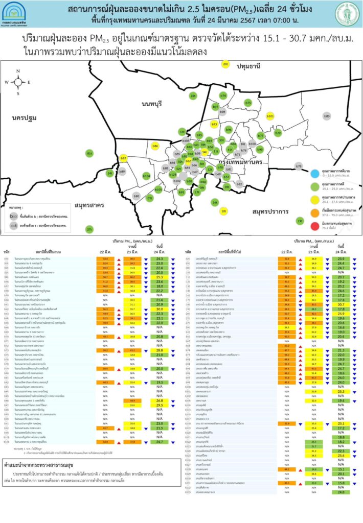 – กรุงเทพมหานครและปริมณฑล ภาพรวมอยู่ในเกณฑ์ดี ตรวจวัดได้ 15.1 – 30.7 ไมโครกรัมต่อลูกบาศก์เมตร
