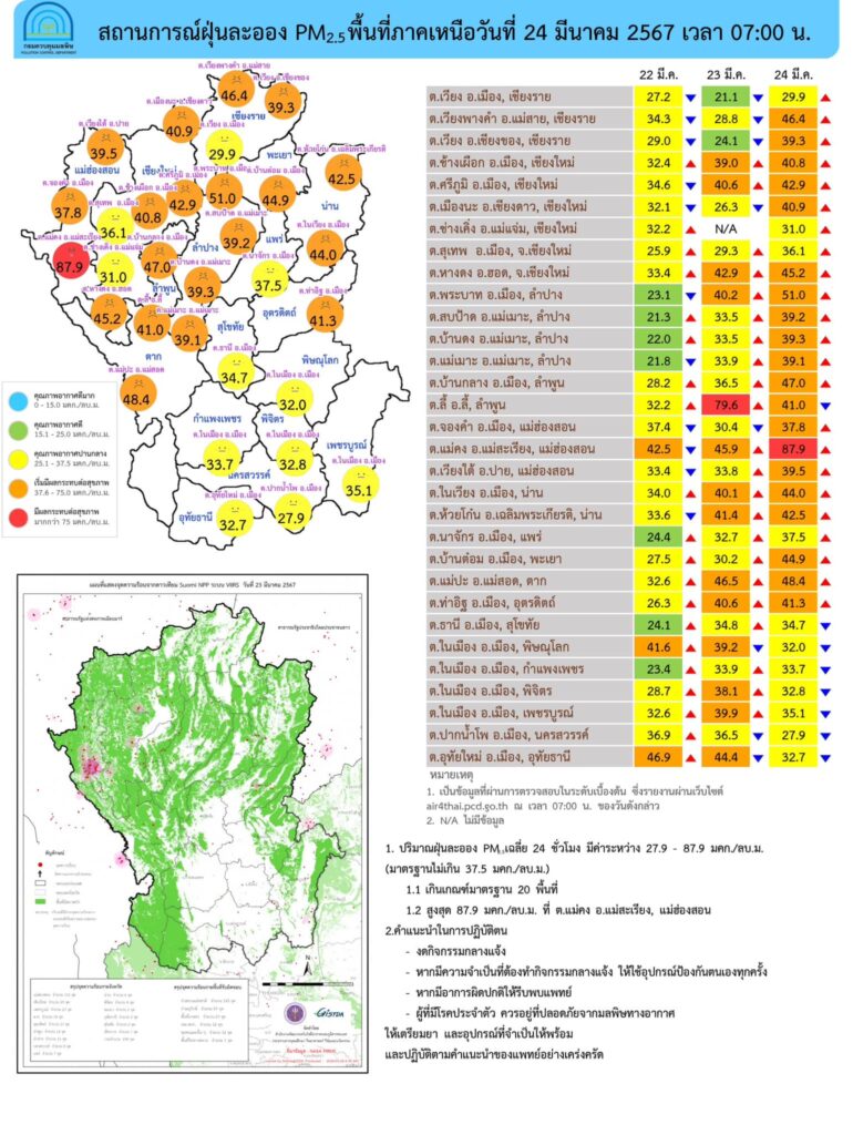 ศูนย์แก้ไขปัญหามลพิษทางอากาศ รายงานการติดตามตรวจสอบคุณภาพอากาศ ประจำวันที่ 24 มีนาคม 2567 เวลา 07.00 น. สรุปดังนี้ ภาพรวมปริมาณ PM2.5 ในประเทศพบเกินค่ามาตรฐานใน 22 จังหวัด ได้แก่ จังหวัดเชียงราย จังหวัดเชียงใหม่ จังหวัดน่าน จังหวัด แม่ฮ่องสอน จังหวัดพะเยา จังหวัดลำพูน จังหวัดลำปาง จังหวัดอุตรดิตถ์ จังหวัดตาก จังหวัดบึงกาฬ จังหวัดเลย จังหวัดอุดรธานี จังหวัดนครพนม จังหวัดสกลนคร จังหวัดมุกดาหาร จังหวัดขอนแก่น จังหวัดกาฬสินธุ์ จังหวัดร้อยเอ็ด จังหวัดอำนาจเจริญ จังหวัดยโสธร จังหวัดอุบลราชธานี จังหวัดศรีสะเกษ