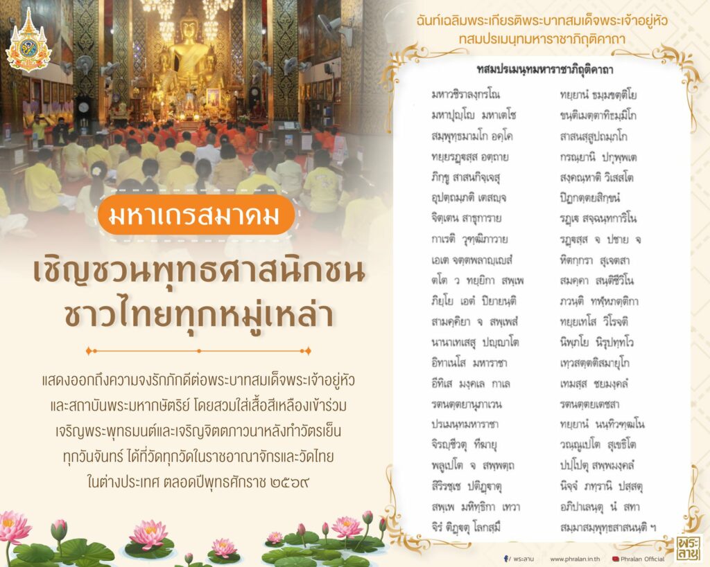มหาเถรสมาคม มีมติให้ใช้ “ฉันท์เฉลิมพระเกียรติพระบาทสมเด็จพระเจ้าอยู่หัว ทสมปรเมนฺทมหาราชาภิถุติคาถา” เนื่องในโอกาสวันเฉลิมพระชมพรรษา 6 รอบ 28 กรกฎาคม 2567 เป็นบทสวดในการเจริญพระพุทธมนต์ด้วยทุกครั้ง