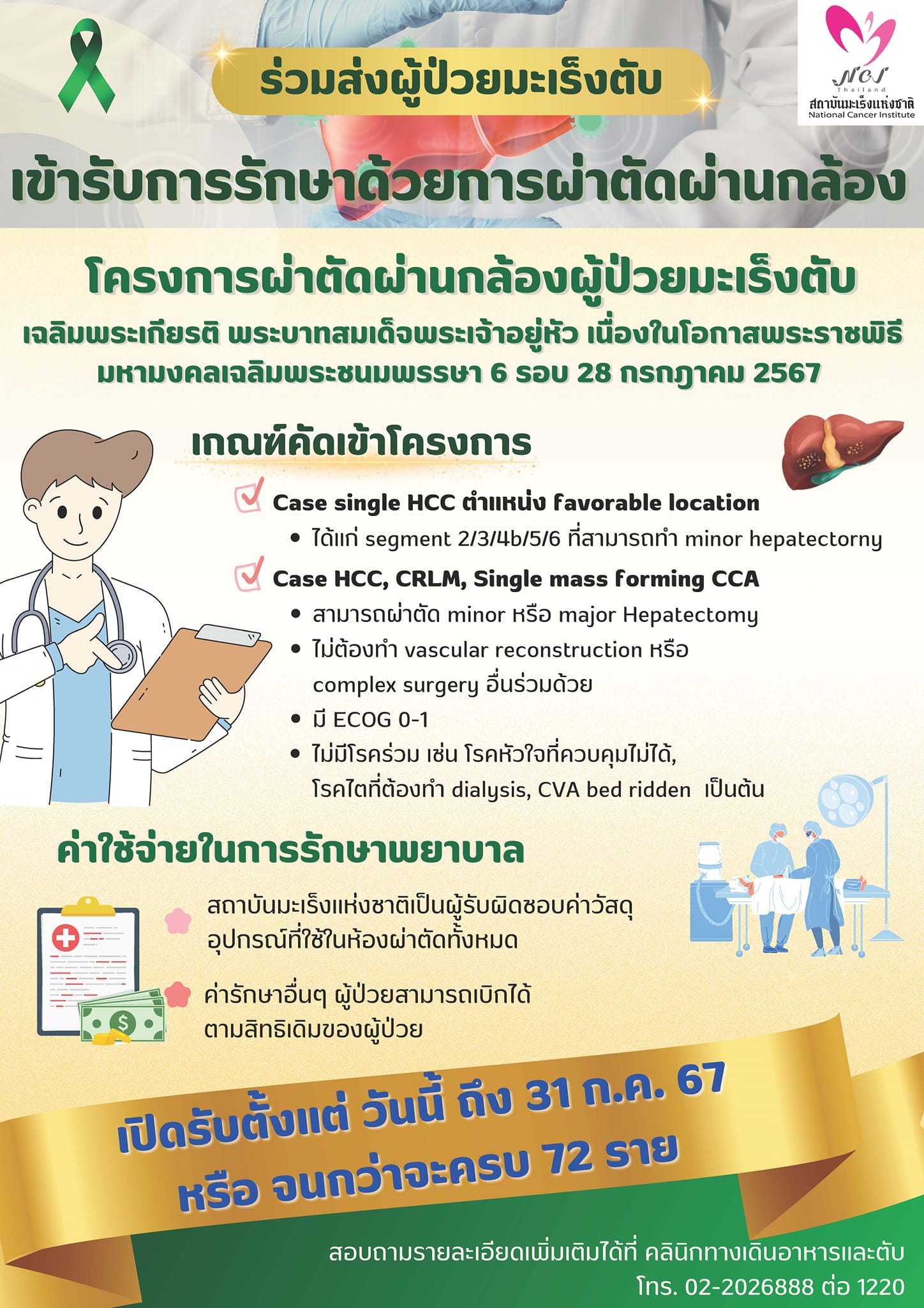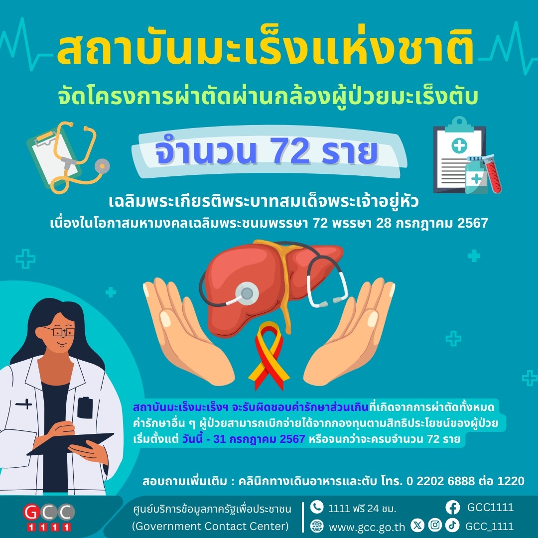 เนื่องในปีพุทธศักราช 2567 ซึ่งเป็นปีมหามงคลที่พระบาทสมเด็จพระเจ้าอยู่หัว ทรงมีพระชนมายุครบ 72 พรรษา ในวันที่ 28 กรกฎาคม 2567 สถาบันมะเร็งแห่งชาติ กรมการแพทย์ จึงจัดโครงการผ่าตัดผ่านกล้องผู้ป่วยมะเร็งตับ เฉลิมพระเกียรติ พระบาทสมเด็จพระเจ้าอยู่หัว เนื่องในโอกาสพระราชพิธีมหามงคลเฉลิมพระชนมพรรษา 6 รอบ 28 กรกฎาคม 2567 แก่ผู้ป่วยจำนวน 72 ราย โดยโครงการดังกล่าว สถาบันมะเร็งมะเร็งแห่งชาติ จะเป็นผู้รับผิดชอบค่ารักษาส่วนเกินที่เกิดจากการผ่าตัดทั้งหมด ส่วนค่ารักษาอื่น ๆ ผู้ป่วยสามารถเบิกจ่ายได้จากกองทุนตามสิทธิประโยชน์ของผู้ป่วย โดยเริ่มตั้งแต่วันนี้ ถึง 31 กรกฎาคม 2567 หรือ จนกว่าจะครบจำนวน 72 ราย สามารถสอบถามรายละเอียดเพิ่มเติมได้ที่ คลินิกทางเดินอาหารและตับ สถาบันมะเร็งแห่งชาติ โทร. 0 2202 6888 ต่อ 1220