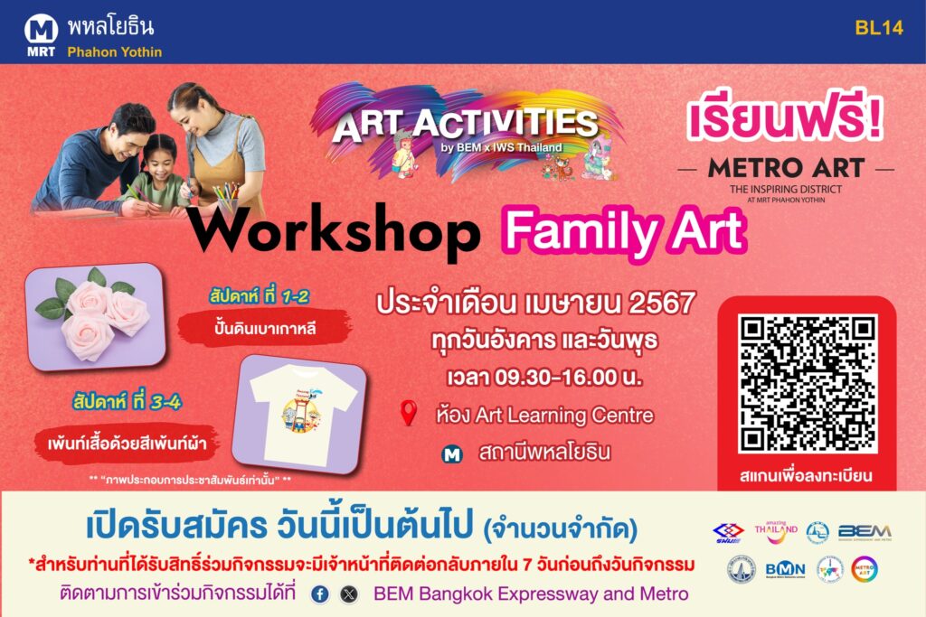 รับสมัครตั้งแต่บัดนี้เป็นต้นไป ผ่านทาง QR Code หรือ https://citly.me/YJMQt (ครอบครัวละไม่เกิน 3 คน) (รับจำนวนจำกัด) เรียนทุกวันอังคาร และวันพุธ เวลา 09.30-16.00 น. ณ ห้อง Art Learning Centre ที่ Metro Mall ชั้นร้านค้า รถไฟฟ้า MRT สถานีพหลโยธิน ติดตามรายละเอียดข่าวสารการเข้าร่วมกิจกรรมได้ผ่าน Facebook : MRT Bangkok Metro