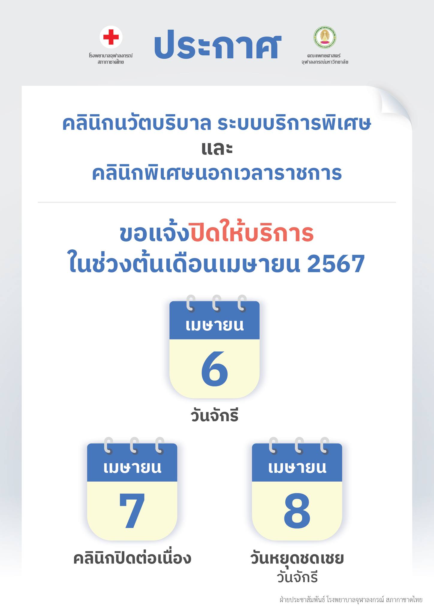 • วันที่ 7 เมษายน 2567 คลินิกปิดต่อเนื่อง