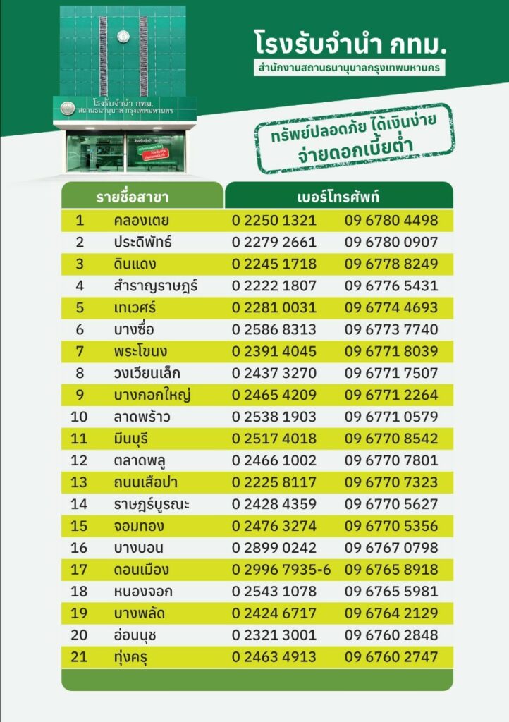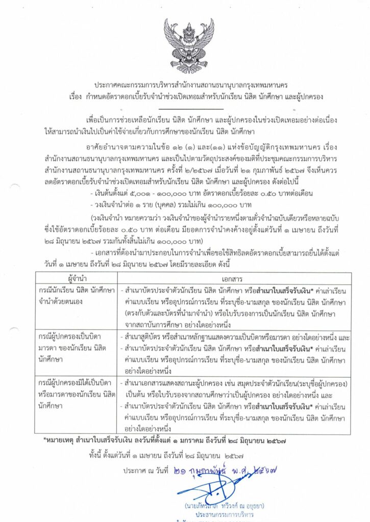 โรงรับจำนำกรุงเทพมหานคร จัดทำโครงการลดดอกเบี้ยเพื่อช่วยเหลือนักเรียน นิสิต นักศึกษา และผู้ปกครอง สำหรับใช้จ่ายในเรื่องอุปกรณ์การเรียนและค่าเทอม ในอัตราดอกเบี้ยร้อยละ 50 สตางค์ ต่อเดือน สำหรับวงเงินจำนำตั้งแต่ 5,001 – 100,000 บาท เริ่มตั้งแต่วันที่ 1 เมษายน – 28 มิถุนายน 2567 ผู้ที่จะเข้าร่วมโครงการต้องมีเอกสารประกอบการจำนำเพื่อขอใช้สิทธิลดอัตราดอกเบี้ย อาทิ สำเนาบัตรประจำตัวนักเรียน นิสิต นักศึกษา เอกสารแสดงความเป็นผู้ปกครอง เป็นต้น ทั้งนี้ สามารถติดต่อใช้บริการได้ที่สถานธนานุบาล (โรงรับจำนำ กทม.) ทั้ง 21 แห่ง ทั่วกรุงเทพมหานคร