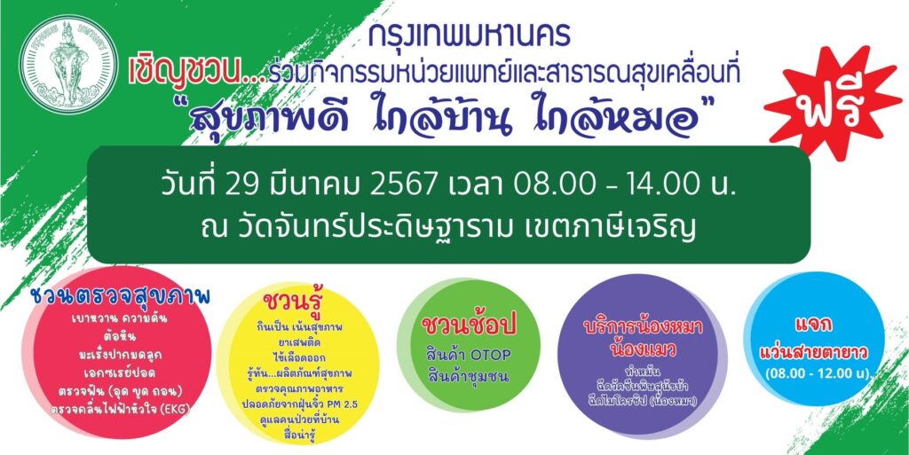 กรุงเทพมหานคร เชิญชวนร่วมกิจกรรมบริการสุขภาพเคลื่อนที่ “สุขภาพดี ใกล้บ้าน ใกล้หมอ” ฟรี ในวันที่ 29 มีนาคม 2567 ตั้งแต่เวลา 08.00 – 14.00 น. ณ วัดจันทร์ประดิษฐาราม เขตภาษีเจริญ กิจกรรมประกอบด้วย