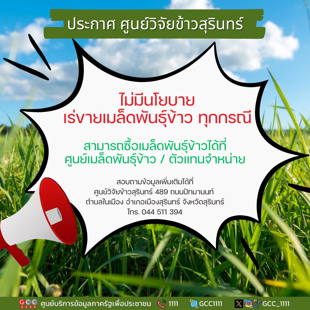 กรมการข้าว ประกาศมีบุคคลแอบอ้างชื่อศูนย์วิจัยข้าวสุรินทร์ เพื่อประชาสัมพันธ์การจำหน่ายเมล็ดพันธุ์ข้าว