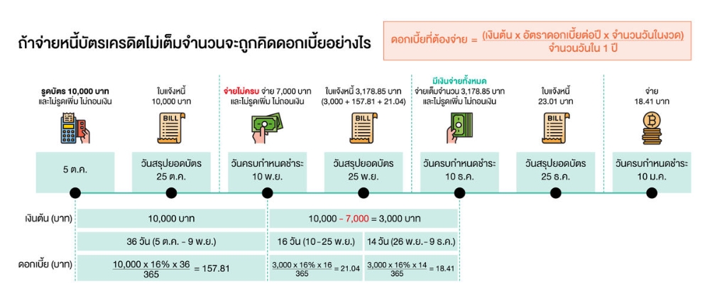 แต่สิ่งที่หลายคนมักเข้าใจผิดก็คือ หากเราจ่ายแค่บางส่วน เช่น รูด 10,000 บาท แต่จ่ายแค่ 7,000 บาท เราก็จะหมดสิทธิ์ที่จะได้ระยะเวลาปลอดดอกเบี้ย และจะถูกคิดดอกเบี้ยจาก 2 ส่วน คือ ส่วนแรก ยอดเต็มจำนวน 10,000 บาท โดยคิดดอกเบี้ยย้อนกลับไปเริ่มตั้งแต่วันที่เรารูดบัตรหรือวันที่บันทึกรายการ จนถึงวันก่อนวันที่เราชำระ และส่วนที่สอง ธนาคารหรือบริษัทบัตรเครดิตจะคิดดอกเบี้ยจากยอดค้าง 3,000 บาท นับจากวันที่เราชำระจนถึงวันก่อนวันที่เราชำระครั้งต่อไปฉะนั้น อย่าลืมถามตัวเองก่อนว่า หากจะใช้บัตรเครดิต เราสามารถจ่ายเต็มจำนวนได้ใช่หรือไม่ เพื่อจะทำให้เราไม่ต้องจ่ายดอกเบี้ย และได้ประโยชน์จากการใช้บัตรเครดิตอย่างแท้จริง