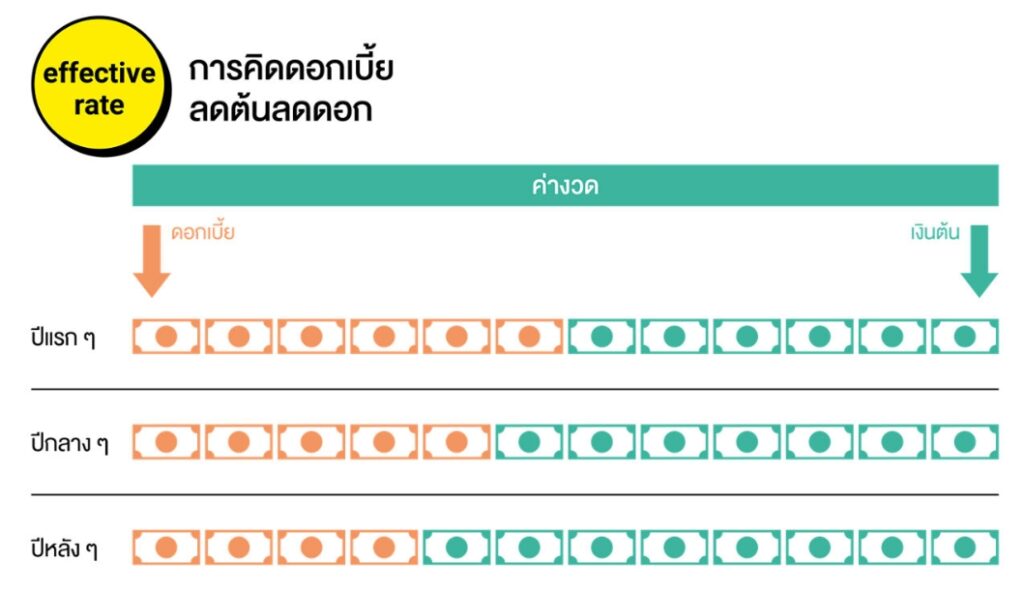 ดอกเบี้ยสำหรับสินเชื่อเพื่อที่อยู่อาศัยเป็นแบบลดต้นลดดอก (effective rate) โดยในการชำระแต่ละงวดจะแยกเป็นเงินต้นและดอกเบี้ย หากจำนวนเงินที่เราชำระเท่ากันทุกงวด ในช่วงปีแรก ๆ ค่างวดที่ชำระส่วนใหญ่จะเป็นดอกเบี้ย และถูกนำมาตัดเงินต้นแค่เล็กน้อยเท่านั้น เพราะเงินต้นยังมีจำนวนสูงอยู่ แต่เมื่อเราชำระไปหลายปีแล้ว ค่างวดจะเปลี่ยนสัดส่วนมาหักชำระเงินต้นได้เยอะขึ้นและเหลือส่วนที่เป็นดอกเบี้ยน้อยลง เพราะเงินต้นมีจำนวนลดลงเรื่อย ๆ