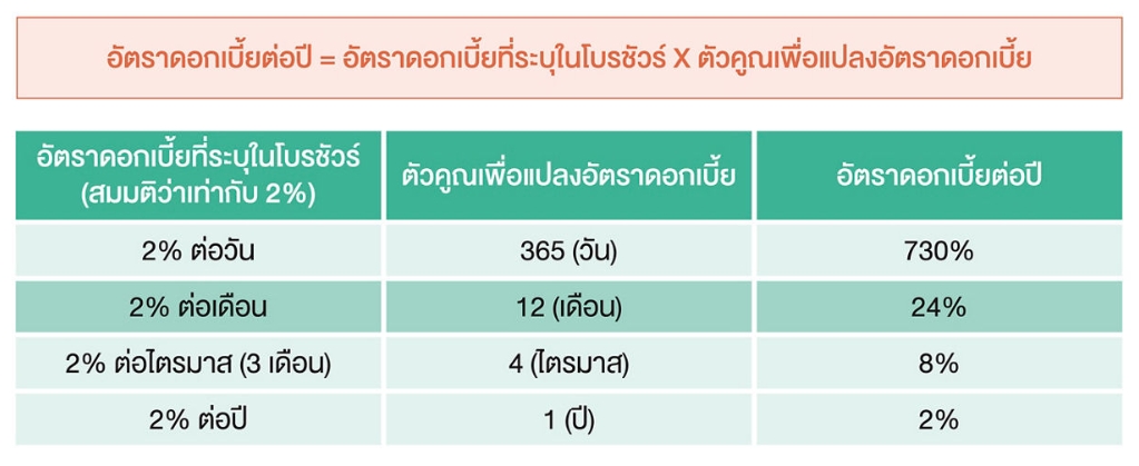 อัตราดอกเบี้ยต่อปี = อัตราดอกเบี้ยที่ระบุในโบรชัวร์ X ตัวคูณเพื่อแปลงอัตราดอกเบี้ย
