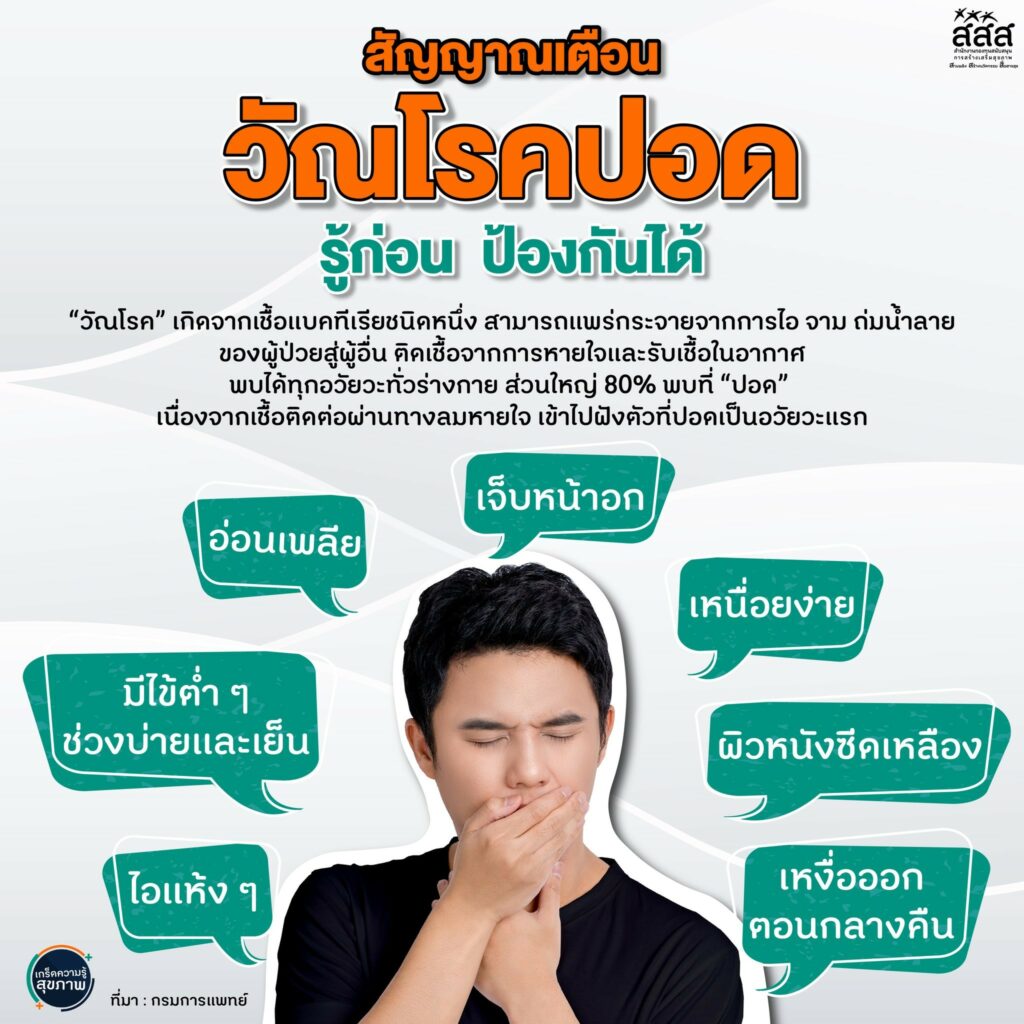 สำนักงานกองทุนสนับสนุนการสร้างเสริมสุขภาพ แจ้งเตือนสัญญาณเตือนวัณโรคปอด รู้ก่อน ป้องกันได้ วัณโรค เกิดจากเชื้อแบคทีเรียชนิดหนึ่ง สามารถแพร่กระจายจากการไอ จาม ถ่มน้ำลาย ของผู้ป่วยสู่ผู้อื่น ติดเชื้อจากการหายใจและรับเชื้อในอากาศ พบได้ทุกอวัยวะทั่วร่างกาย ส่วนใหญ่ 80% พบที่ปอด เนื่องจากเชื้อติดต่อผ่านทางลมหายใจ เข้าไปฝังตัวที่ปอดเป็นอวัยวะแรก