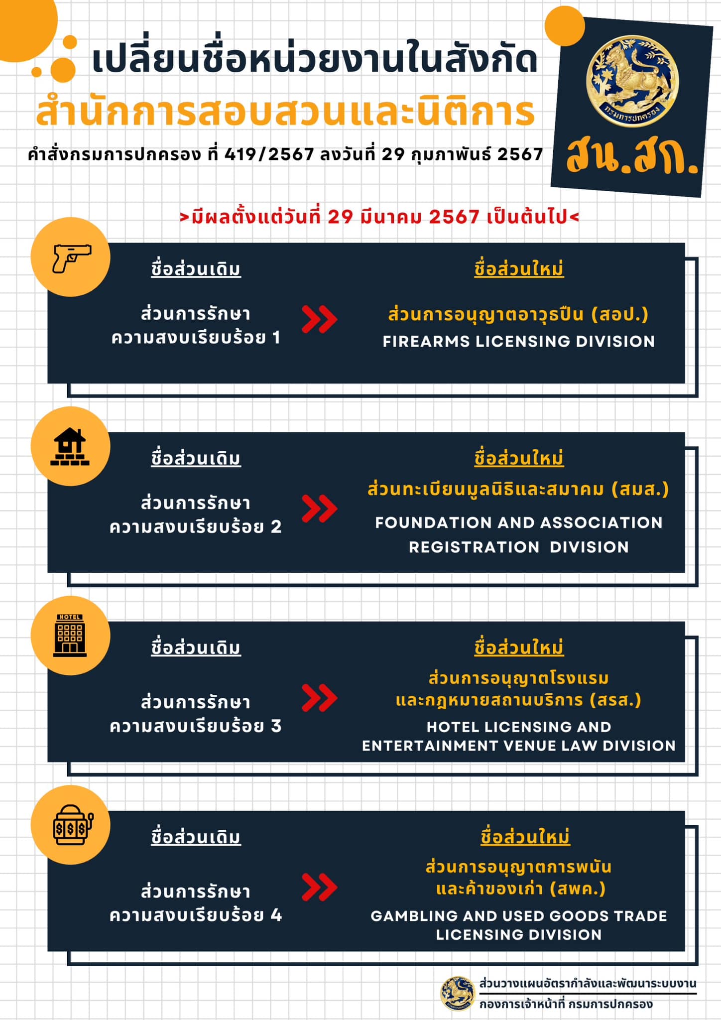 กรมการปกครอง เปลี่ยนชื่อหน่วยงานในสังกัดสำนักการสอบสวนและนิติการ (สน.สก.)