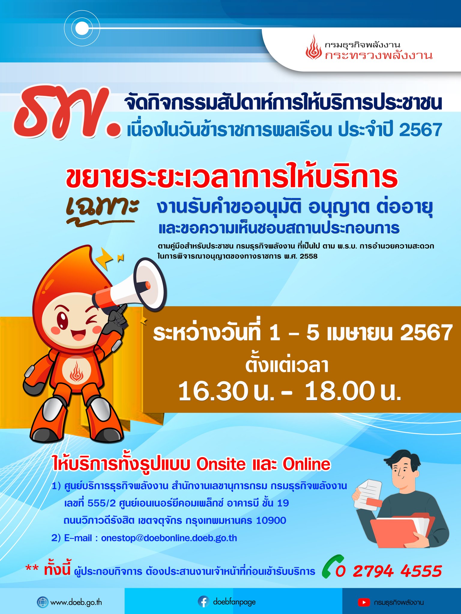 ธพ. จัดกิจกรรมสัปดาห์การให้บริการประชาชน เนื่องในวันข้าราชการพลเรือน ประจำปี 2567 ขยายระยะเวลาการให้บริการ เฉพาะ งานรับคำขออนุมัติ อนุญาต ต่ออายุ และขอความเห็นชอบสถานประกอบการ ตามคู่มือประชาชน กรมธุรกิจพลังงาน ที่เป็นไปตาม พ.ร.บ. การอำนวยความสะดวกในการพิจารณาอนุญาตของทางราชการ พ.ศ. 2558 ระหว่างวันที่ 1 – 5 เมษายน 2567 ตั้งแต่เวลา 16.30 – 18.00 น.